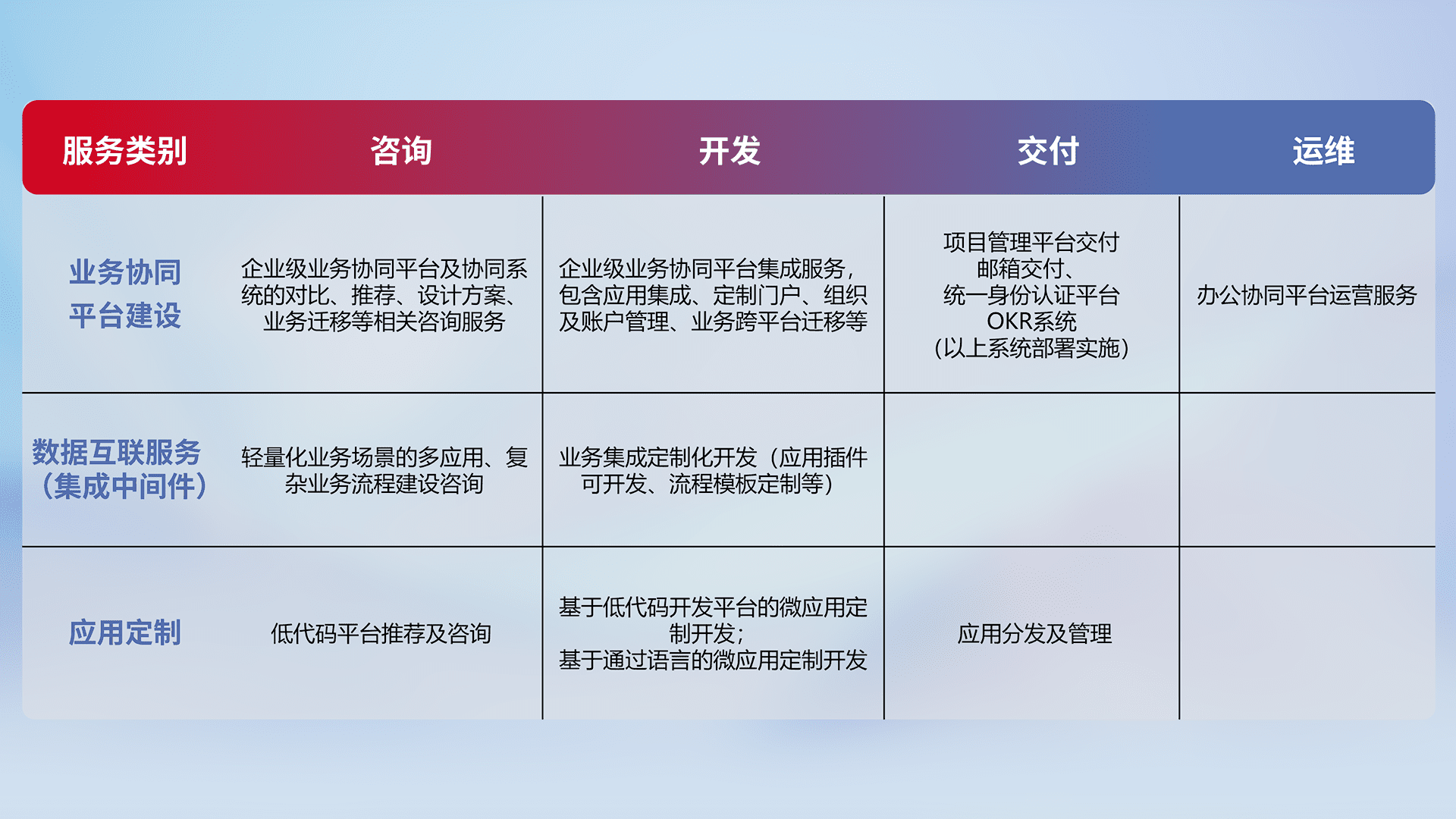 针对钉钉、、、企微、、、、IDaas等平台级产品提供产品的规划、、、方案、、、、交付、、、、定制化开发等服务,,,实现如统一协同办公、、、、智能客户服务、、、、混合会议管理、、、、智能数据查询、、、等业务场景,,,,实现数字化转型。。。。